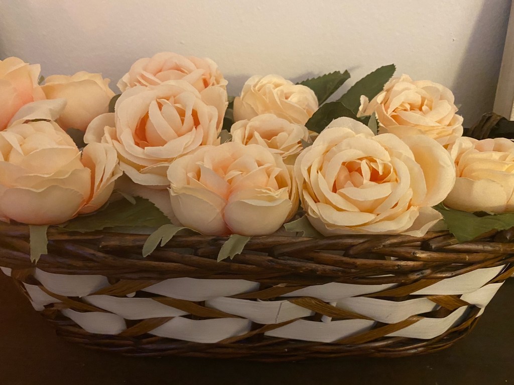 This last floral arrangement was actually the first thing I set up when I started decorating. Inside of the basket (where you can’t see) are pumpkins which I used as filler and then I covered it with a white material. I picked the flowers off of the stem along with the leaves and arranged them on top of the basket. You can really use any basket to recreate this look and here are similar florals from Michaels.