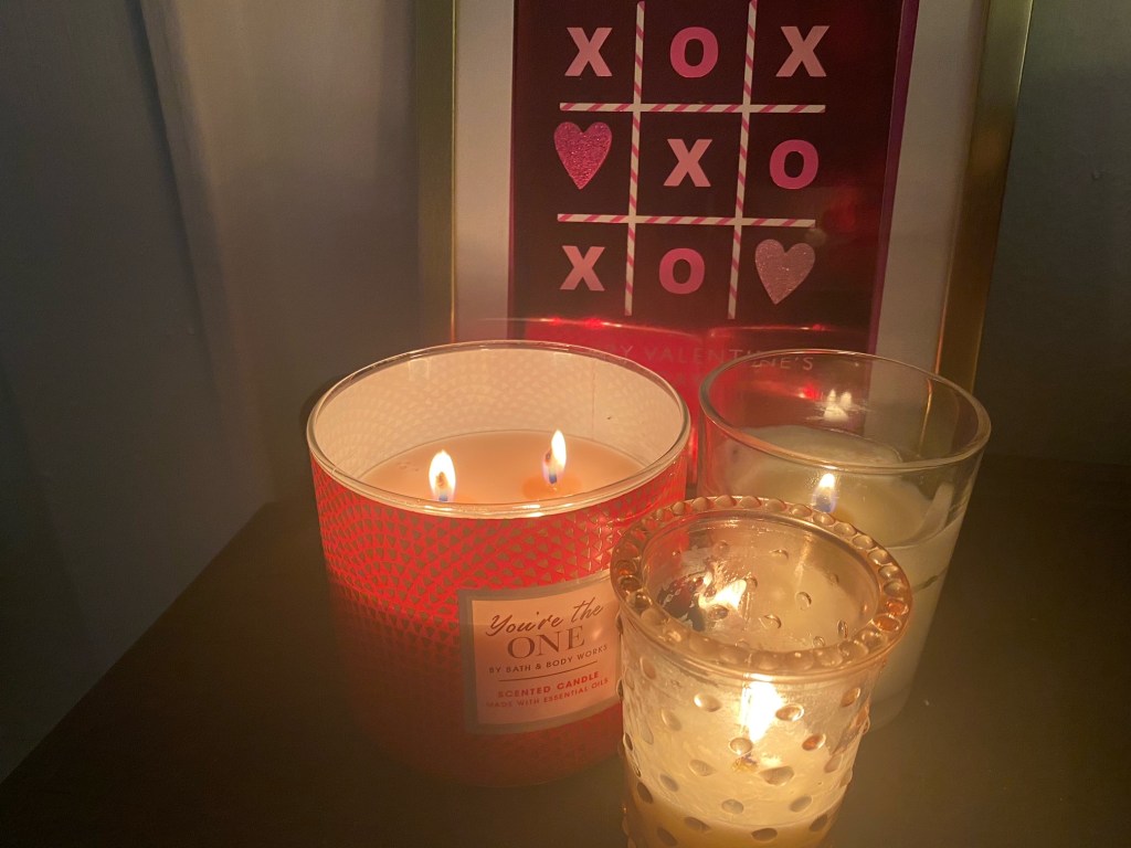 Starting in the back I bought this gold frame and XOXO tic tac toe card from the dollar store. Now I can’t take credit for the card idea, I saw it on YouTube but it’s great because you can change out cards per holiday. As for the candles the one on the left is the You’re the ONE candle from Bath & Body works and the other two are also from the dollar store.