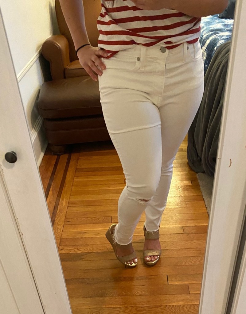 These Madewell jeans are super flattering! They could be paired with heels and a blouse or styled casually with a t-shirt and sneakers. They retail for $130 and the Thred Up price is $38.99.