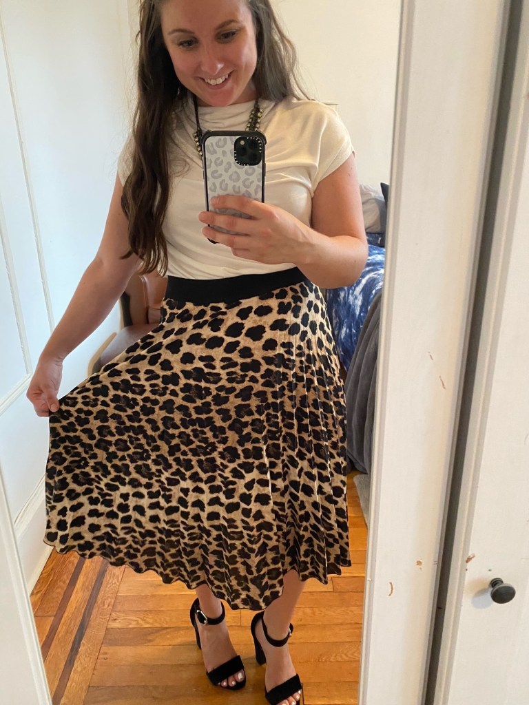 This leopard print Zara skirt is so fun to wear! It’s a pleated midi skirt with a stretch waist and hangs just below the knee. I was on the fence about this one so I posted on Instagram for some outside perspective. The overwhelming majority voted in favor of keeping it so I have! The retail price is $40 and the Thred Up price is $28.99.